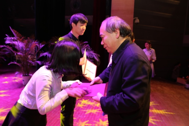 Zhang Yibin, chancellor of Nanjing University, and Chen Jun, academician of the Chinese Academy of Sciences and president of the university, presented to Yu Fan and other nine students the certificates and cups with the honorary title of “Student of 2016 at Nanjing University.”