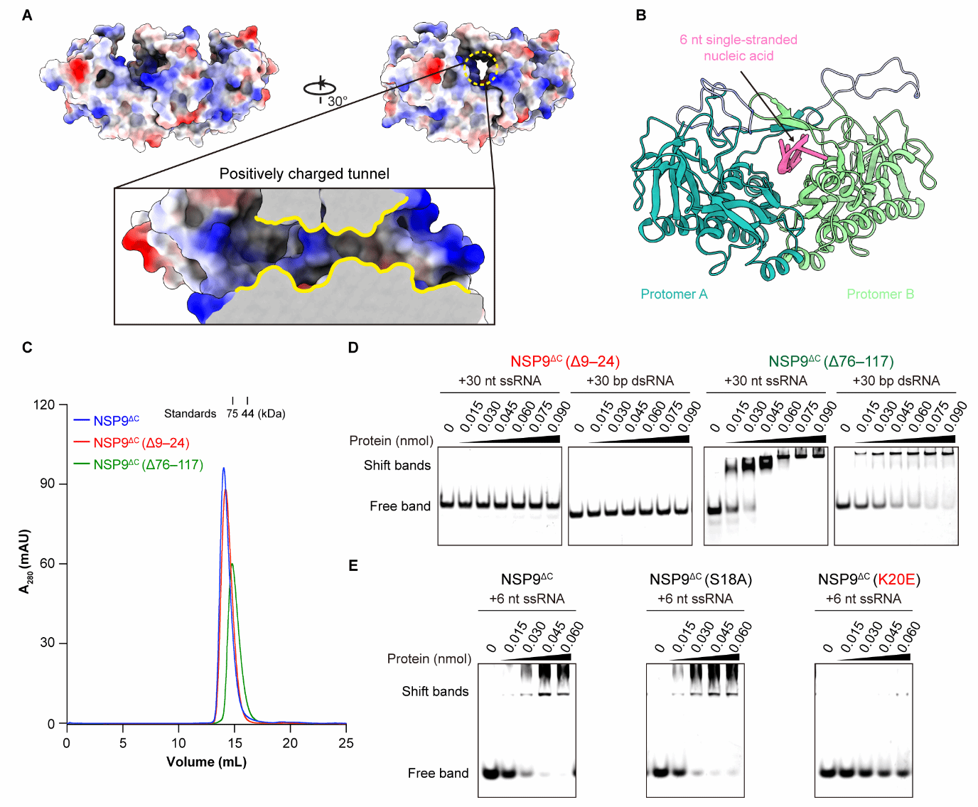 进一步的生化实验中,研究团队检测了NSP9ΔC与核酸的相互作用特性。结果显示随着蛋白浓度的升高,NSP9ΔC具有依次与单链核酸形成不同形式复合物的能力,在凝胶迁移实验中表现为依次出现两个不同的迁移条带。然而,当使用双链核酸进行测试时,并未观察到类似的现象,表明NSP9ΔC该结合模式严格依赖于单链核酸,体现了其高度的特异性。分析NSP9ΔC二聚体的结构特征发现,NSP9的N端“手臂样”(Arches)结构可以通过分子间作用力进一步形成类似“雨篷”(Awning)的结构。同时,二聚体的底部也通过大量分子间氢键和疏水作用力的紧密协作,形成了一个稳固的“拉链样”(Zipper)二聚界面。这两个结构特点共同作用,围绕并构成了一个封闭的、富含正电荷氨基酸的“通道”(Tunnel)。