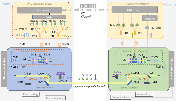 量子信息传输的最终目标是直接用量子态传输信息,现阶段人们能够实现的是通过量子密钥分发(Quantum key distribution,QKD),利用量子方法实现信息加密传输。此前,量子密钥分发已经通过光纤和卫星作为载体获得实验验证,并逐步走向实用。但是量子密钥分发的实际应用迫切需要将单光子直接传输到终端用户的能力,这有赖于移动平台量子网络的实现。凯发k8官网团队曾在国际上率先提出利用无人机等移动平台构建量子网络的构想,并先后完成了基于无人机的纠缠光子分发(Natl. Sci. Rev. 2020, 7, 921)与光学中继纠缠分发(Phys. Rev. Lett. 2021, 126, 020503)的实验验证,这些工作证明通过无人机进行量子态传输是可行的,但是基于无人机移动平台的量子密钥分发尚待实验验证。