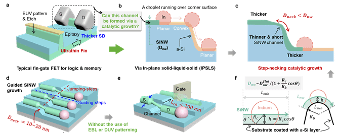 针对这一挑战,凯发k8官网余林蔚教授、王军转教授和扬州大学胡瑞金老师,基于自主创新的面内固-液-固(IPSLS) 纳米线生长模式,首次提出利用催化“液滴阶跳”生长动态,成功实现超细、超短晶硅纳米线沟道阵列的可靠集成制备。具体而言,基于IPSLS生长模式的低温定位生长(<350℃)能力,将催化液滴精确引导生长到跳跃交叉台阶边缘,通过控制柔性液滴跨越台阶的“Step-Necking收缩”效应,在台阶边缘一步成形地生长出所需的Thick(45nm)/Thin(25nm)/Thick(45nm)超精细沟道结构,其中超细沟道长度仅为Lg~90 nm,并且在两端粗线提供了自然的理想S/D接触—完全类似于与先进鳍栅晶体管 (Fin-FET) 中理想沟道和S/D接触架构。