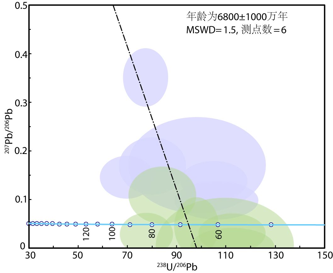 图3. 高镁玻璃G1-GB-1的U-Pb年龄。紫色误差椭圆为未校正数据,绿色误差椭圆为校正后数据。