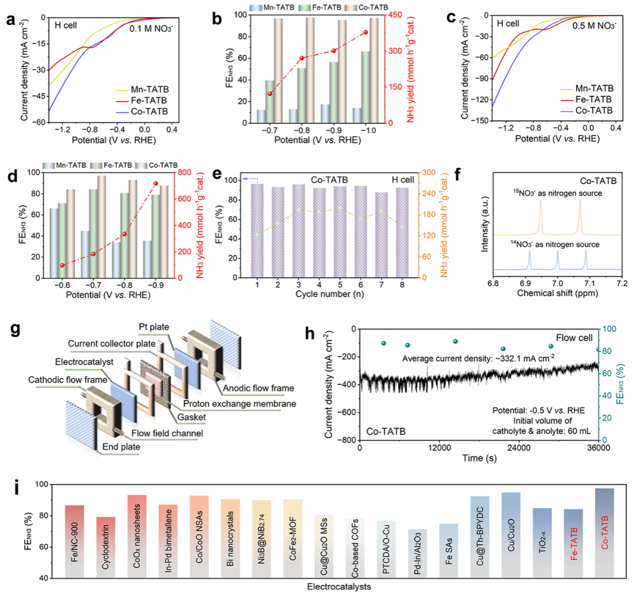 图4. 金属-有机聚合物的电催化硝酸根还原性能