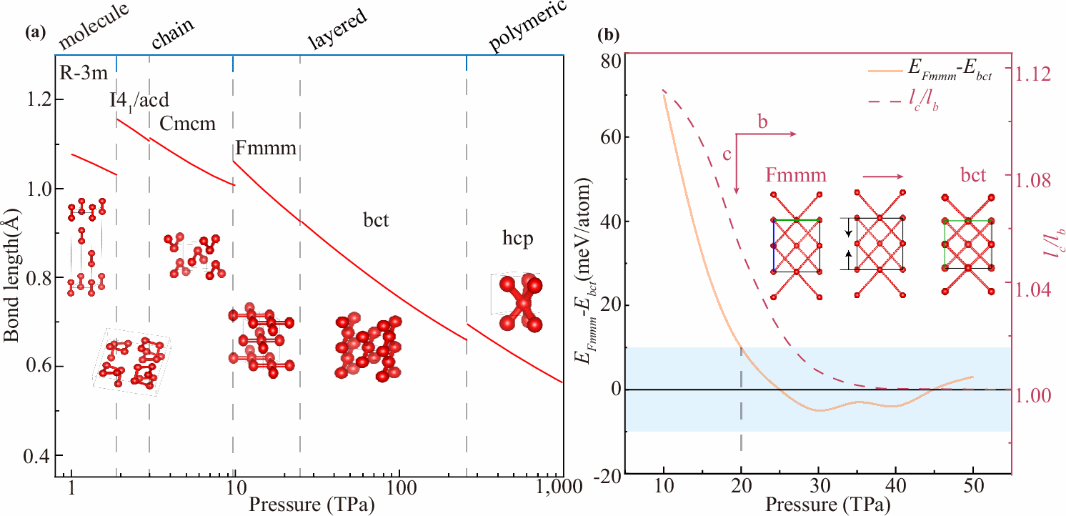 氧作为宇宙中丰度最高的元素之一,其在极端条件下的物质状态对于理解天体的形成和演化至关重要。早期实验研究表明,氧在约100 GPa左右逐渐转变为金属态【Phys. Rev. Lett. 74, 4690 (1995); Nature 393, 767 (1998); Phys. Rev. B 76, 064101 (2007)】。孙建教授等人早期通过第一性原理计算揭示,氧在TPa压强下从分子相转变为螺旋链状聚合结构,然后是层状正交相(空间群Fmmm),并且具有超导性【Phys. Rev. Lett. 108, 045503 (2012)】。Cogollo-Olivo等人【Phys. Rev. B 98, 094103 (2018)】补充计算了氧在1–10 TPa压强范围内的相边界。然而,上述研究表明,氧即使在10 TPa仍未完全聚合为三维网络结构,孤对电子的强排斥作用严重阻碍其深层聚合过程。当前研究面临双重挑战:一方面是在TPa及以上压力,采用更小截断半径赝势和更高能量截断导致的计算成本剧增;另一方面是传统力场无法准确描述物质在如此超高温高压条件下的动力学行为。这导致氧在超高压下的聚合路径与动力学性质长期存疑,尤其涉及白矮星等致密天体环境——其包层压力可达TPa甚至更高量级【Nature584, 51(2020)】。白矮星作为“宇宙时钟”,其冷却速率直接关联星系演化年龄估算【Astron. Astrophys. Rev. 27, 7 (2019)】,而近期星震学分析表明,部分白矮星实际氧含量远超理论预期【Nature 554, 73 (2018)】,氧包层与氦包层热输运性质的显著差异将深刻影响星球的冷却过程【Astron. Astrophys. Rev. 18, 471 (2010)】。
