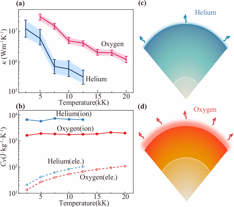 在此基础上,为了阐明这种氧包层对白矮星条件下热演化的影响,研究团队使用Kubo Greenwood方法计算了200TPa下氧和氦的热导率,并同时计算了等容比热容,发现在同等条件下氧包层相较于氦包层具有更高的热导率和更低的等容比热容,因此能够比氦包层更有效地传导和释放热量。