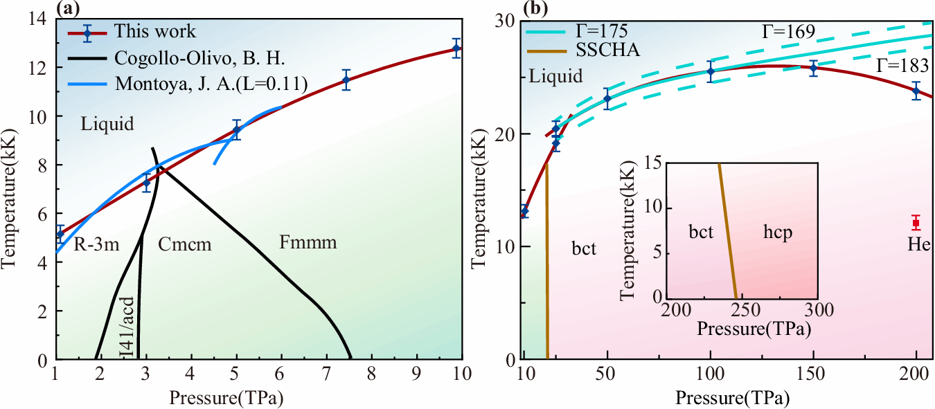 为了进一步探索这种电子结构对有限温度动力学行为的影响,研究团队利用孙建课题组与樊哲勇等人合作开发的GPUMD分子动力学软件包【J. Chem. Phys. 157, 114801 (2022)】通过两相方法计算了高达200TPa的氧的熔化曲线,并通过使用随机自洽简谐近似(SSCHA)方法确定bct和hcp相之间的相边界。与天文学中传统库仑耦合参数Γ估算白矮星熔点相比,本工作成功地揭示了bct相在100TPa以上的反常熔化。