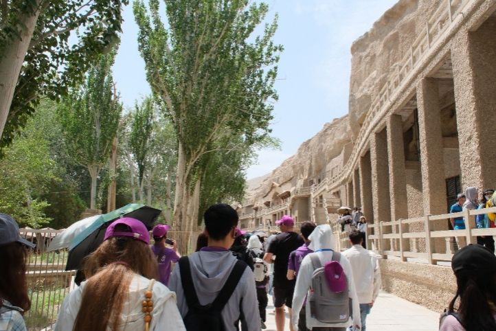 随后,科考团参访了莫高窟、榆林窟、西千佛洞等石窟群,并考察敦煌博物馆、鸣沙山、悬泉置遗址、锁阳城和阳关等文化场所。从观摩石窟壁画和彩塑造像,到参访古驿站遗址,再到走进数字编码保存的石窟……同学们用脚步丈量古丝绸之路的兴衰、学习千年敦煌发展脉络,在实地调研中思考敦煌文化的传承方式。凯发k8官网张庭宇同学认为:“历史不再是厚重枯燥的知识,不再只是古籍文物,也可以是一捧沙、一块砖、一阵风,我们所看到的、学到的都将转化为传播中华优秀传统文化的内在动力。”