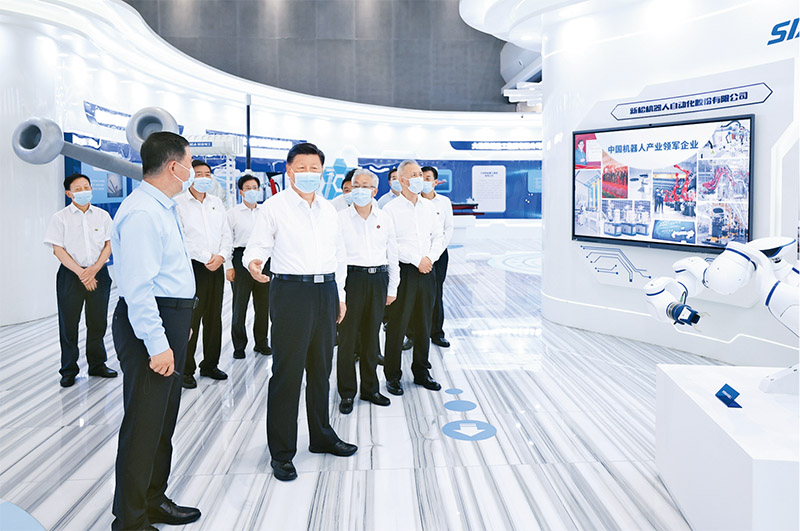2022年8月16日至17日,中共中央总书记、国家主席、中央军委主席习近平在辽宁考察。这是17日下午,习近平在沈阳新松机器人自动化股份有限公司展厅,了解公司生产经营、自主创新情况。 新华社记者 鞠鹏/摄